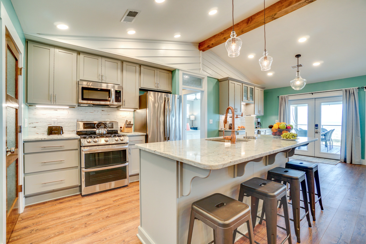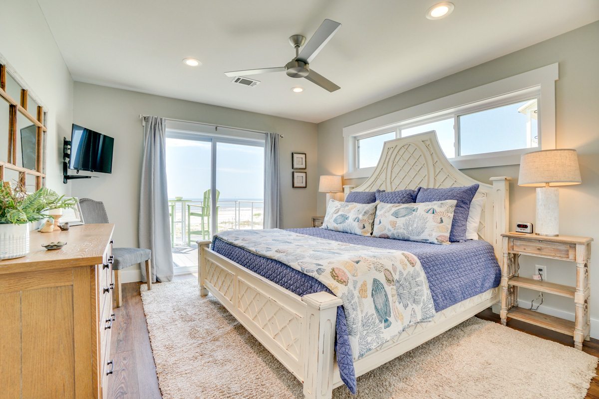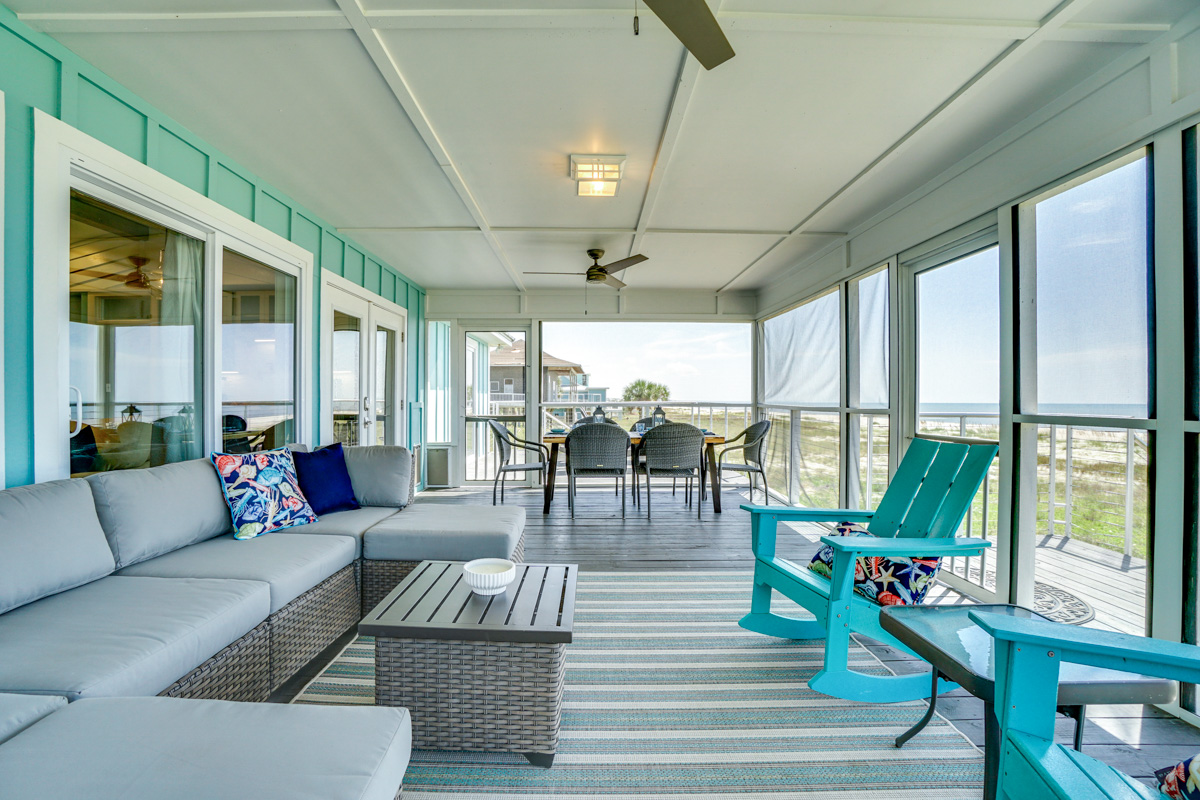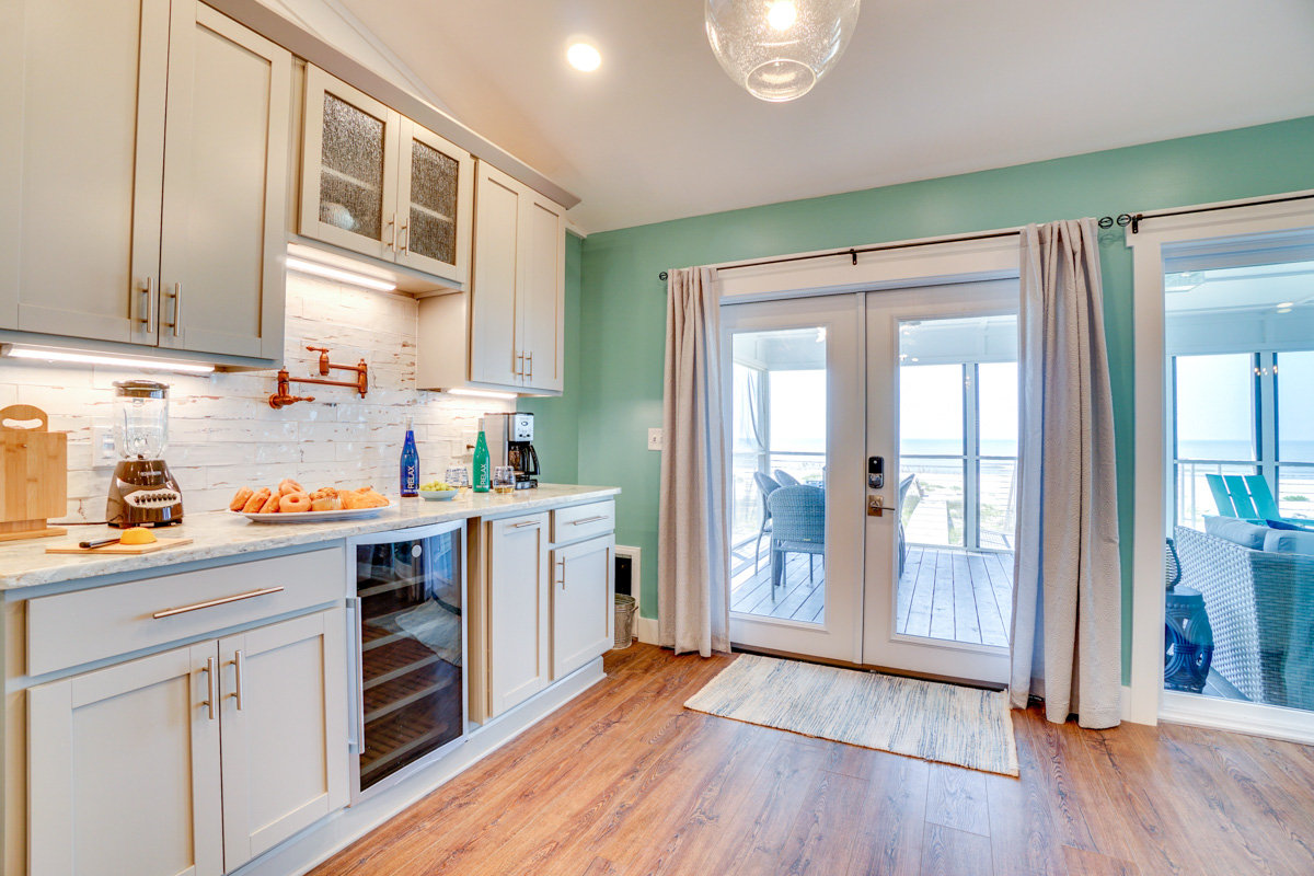 Easily enjoy home-cooked meals throughout your stay with a convenient gourmet kitchen, complete with a granite island and countertops, stainless steel appliances, a wine fridge, and a massive pantry. You’ll also find a unique copper pot filler for coffee. Enjoy your morning cup on the porch, where a full-length outdoor sofa and rocking chairs allow for bug-free relaxation while you listen to the waves.