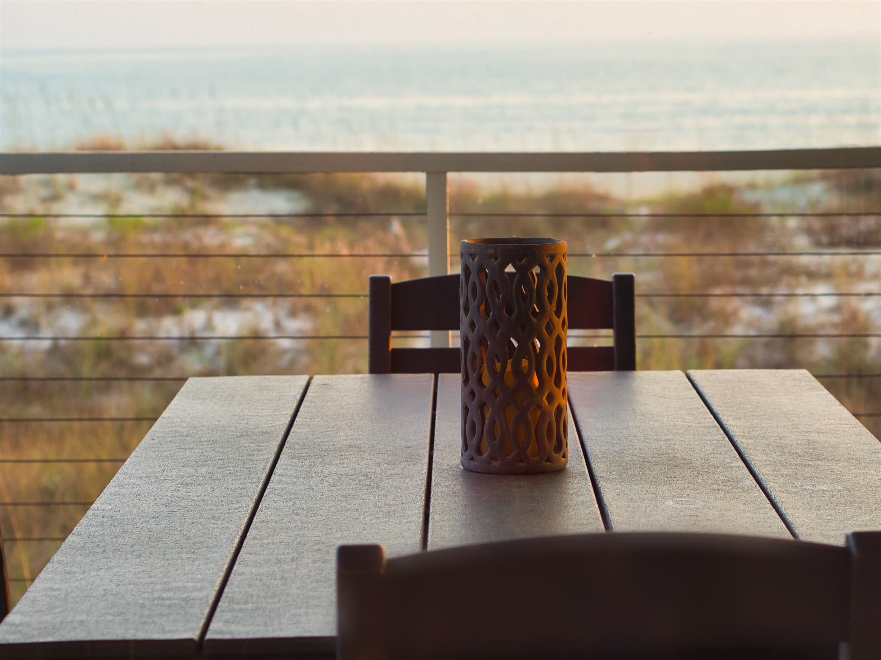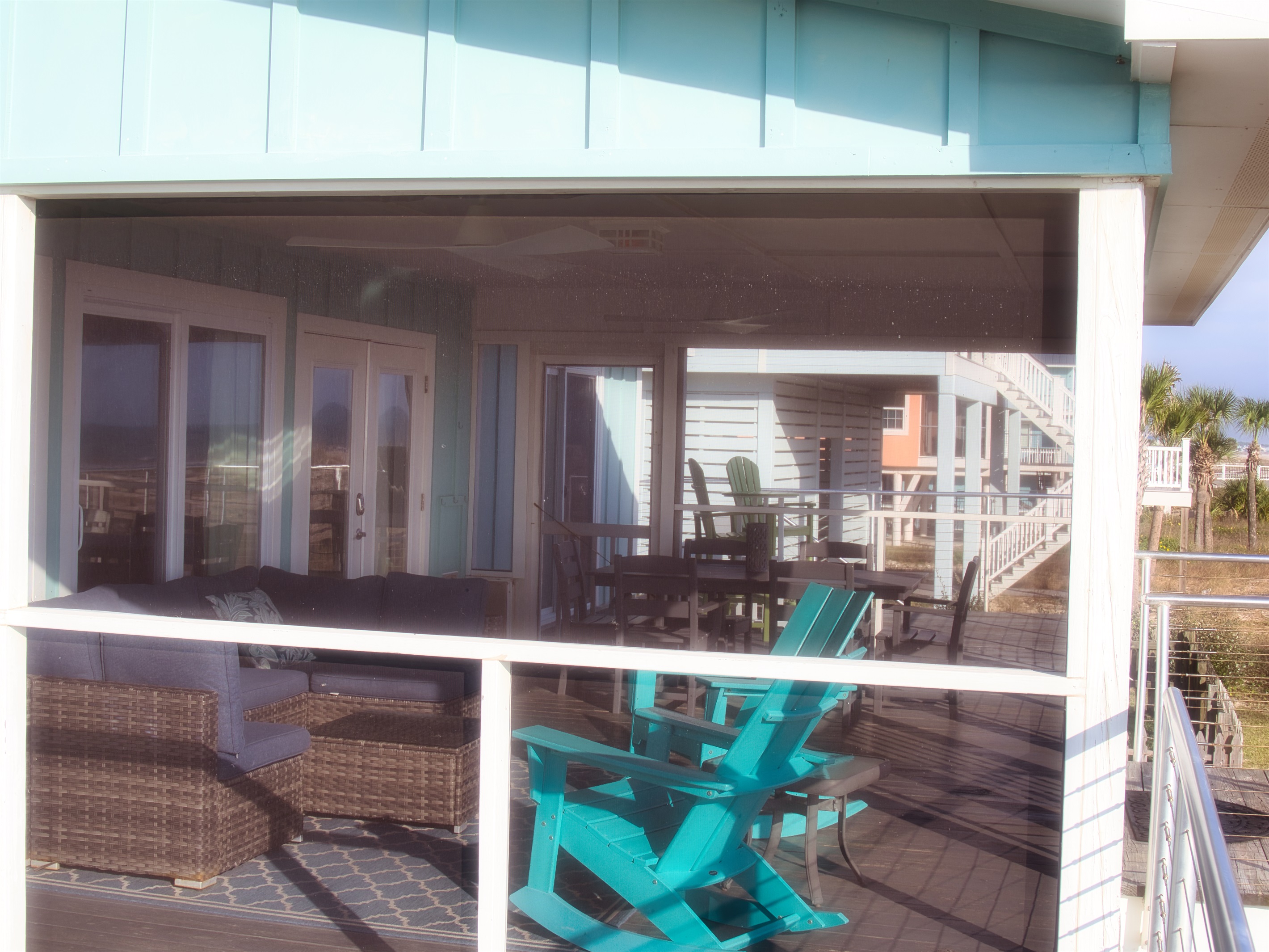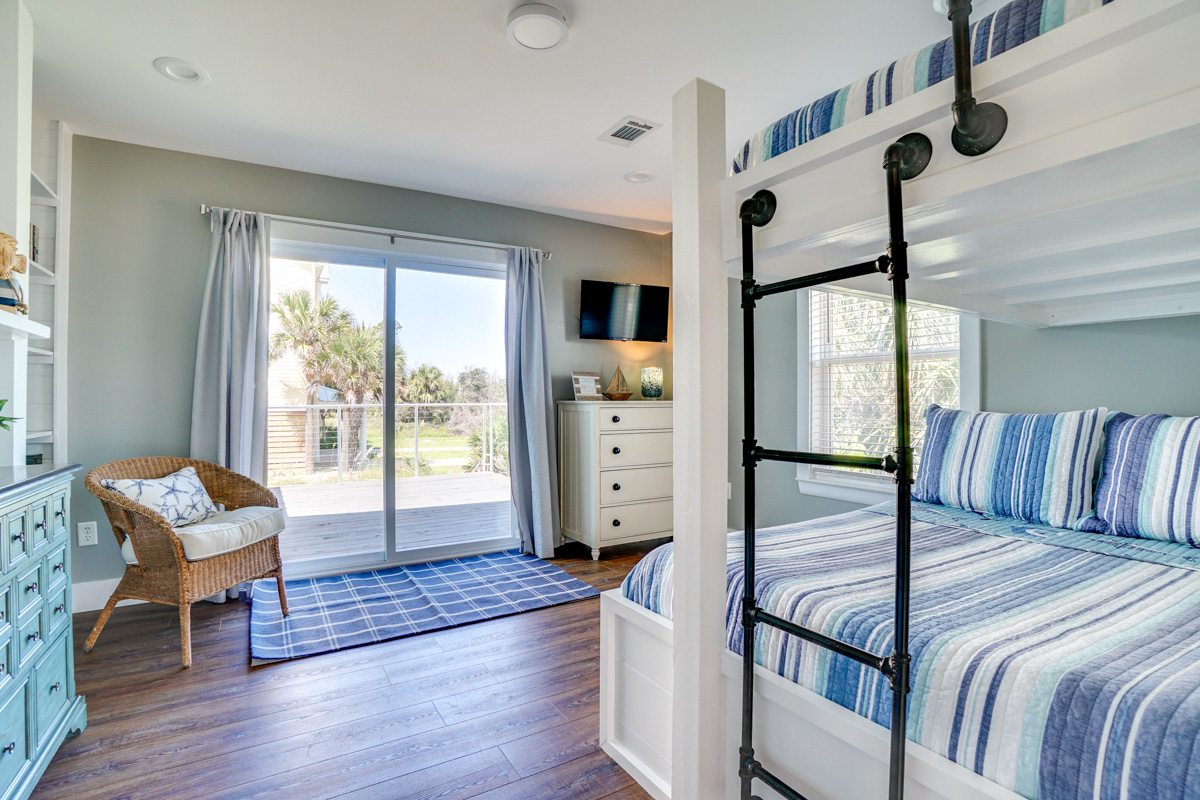 Easily enjoy home-cooked meals throughout your stay with a convenient gourmet kitchen, complete with a granite island and countertops, stainless steel appliances, a wine fridge, and a massive pantry. You’ll also find a unique copper pot filler for coffee. Enjoy your morning cup on the porch, where a full-length outdoor sofa and rocking chairs allow for bug-free relaxation while you listen to the waves.