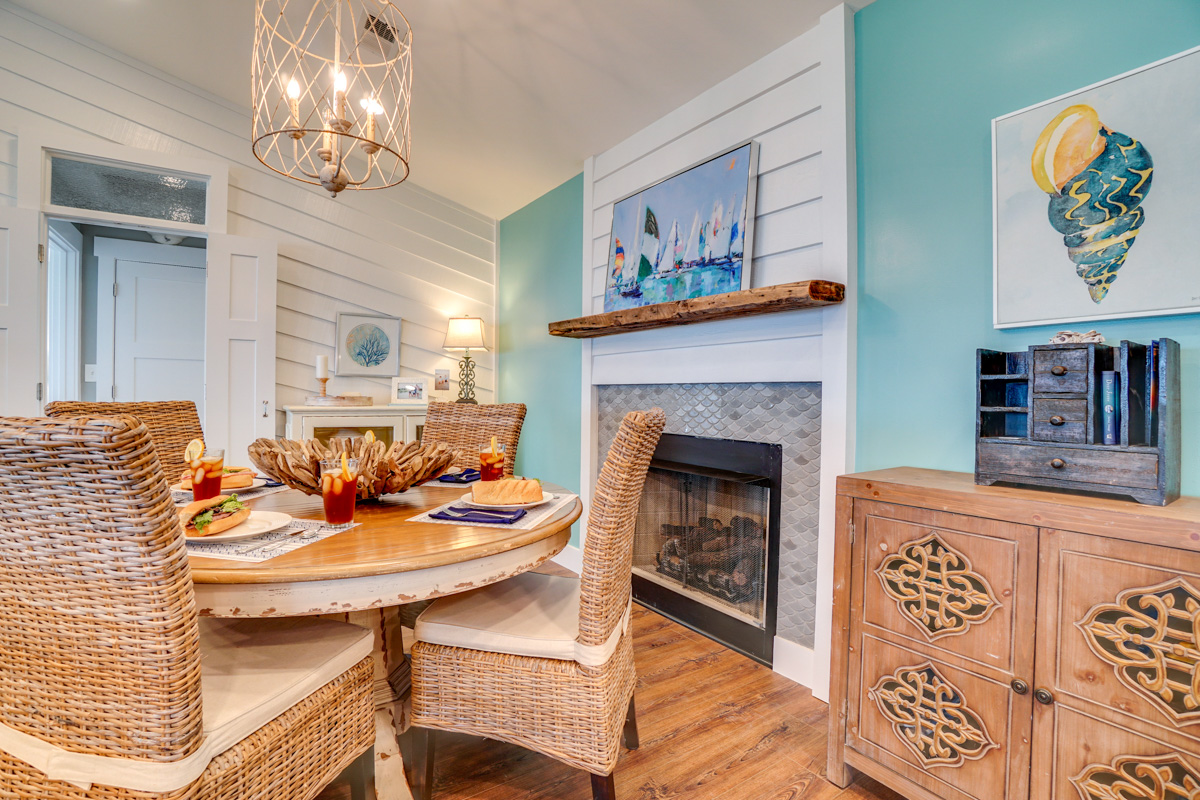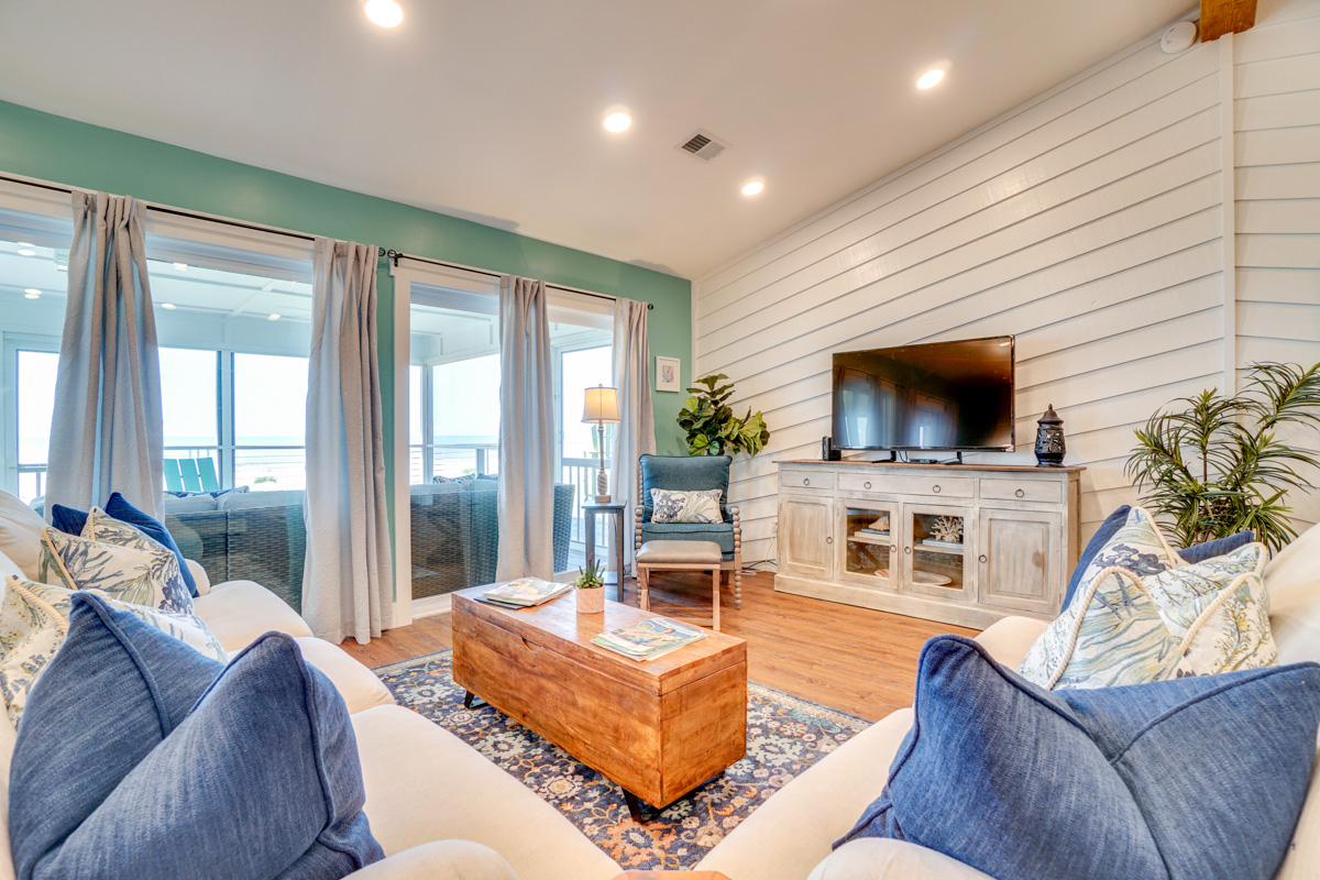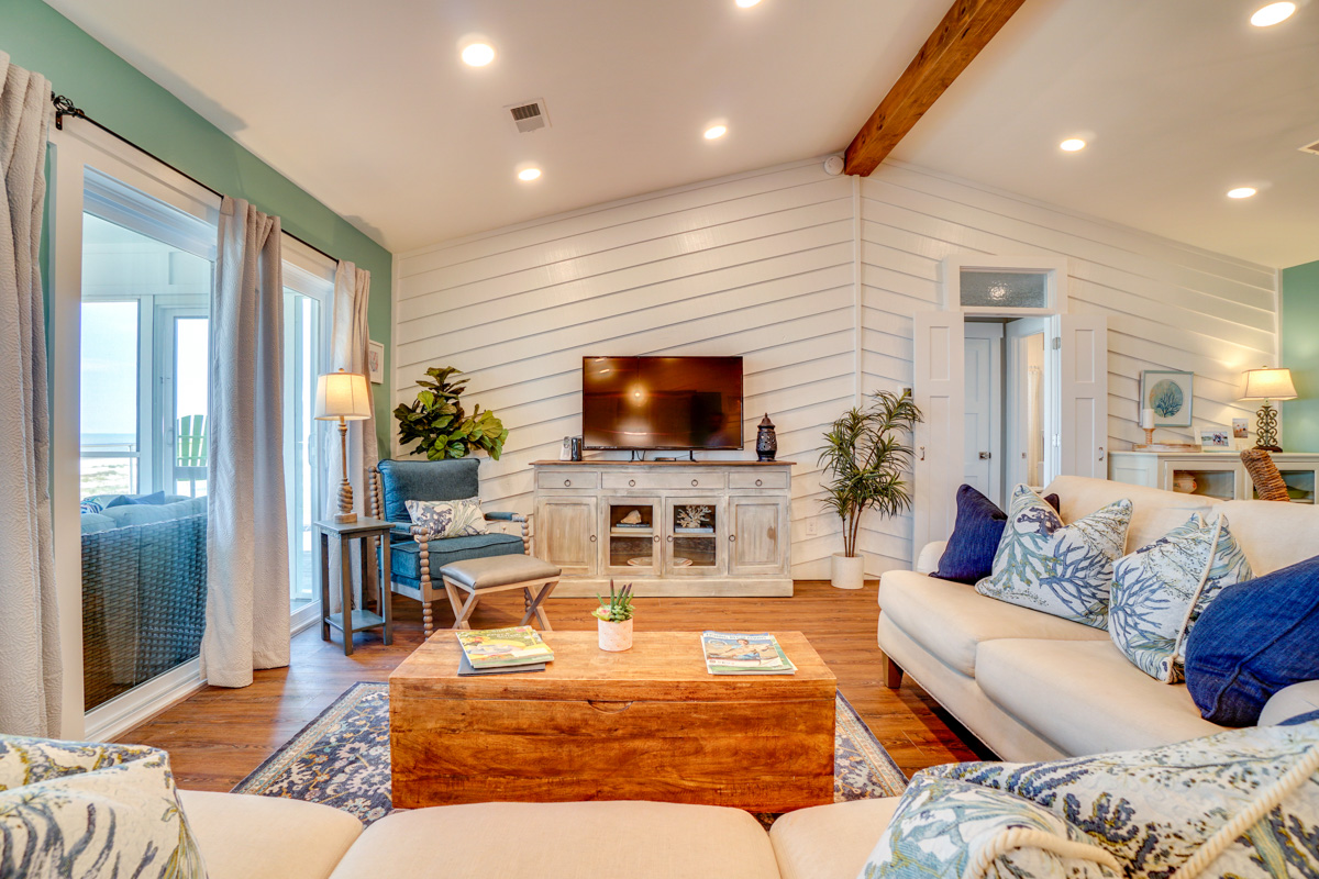 An open-concept living area greets guests with vaulted ceilings and wall-to-wall glass windows overlooking a large screened porch and beyond to the ocean. One full-length sofa and one over sized love seat frame a large-screen TV, while a gas fireplace adds a feeling of coziness on breezy nights. Between a four-seat dining area and four high-top chairs at the breakfast bar, the home easily seats 8 guests inside for dinner -- or dine on the screened porch, where a 6-8 seat table offers an ocean view.