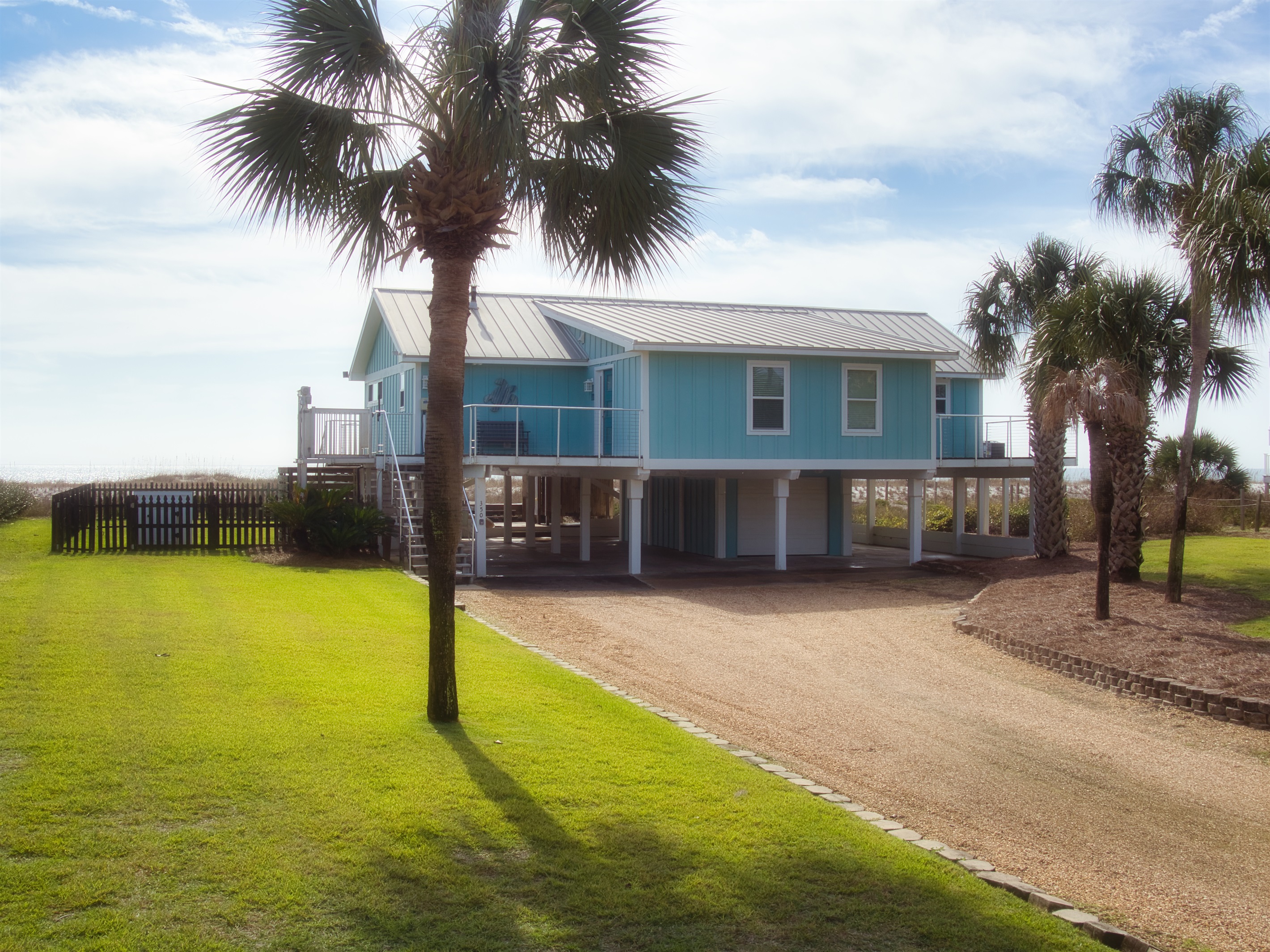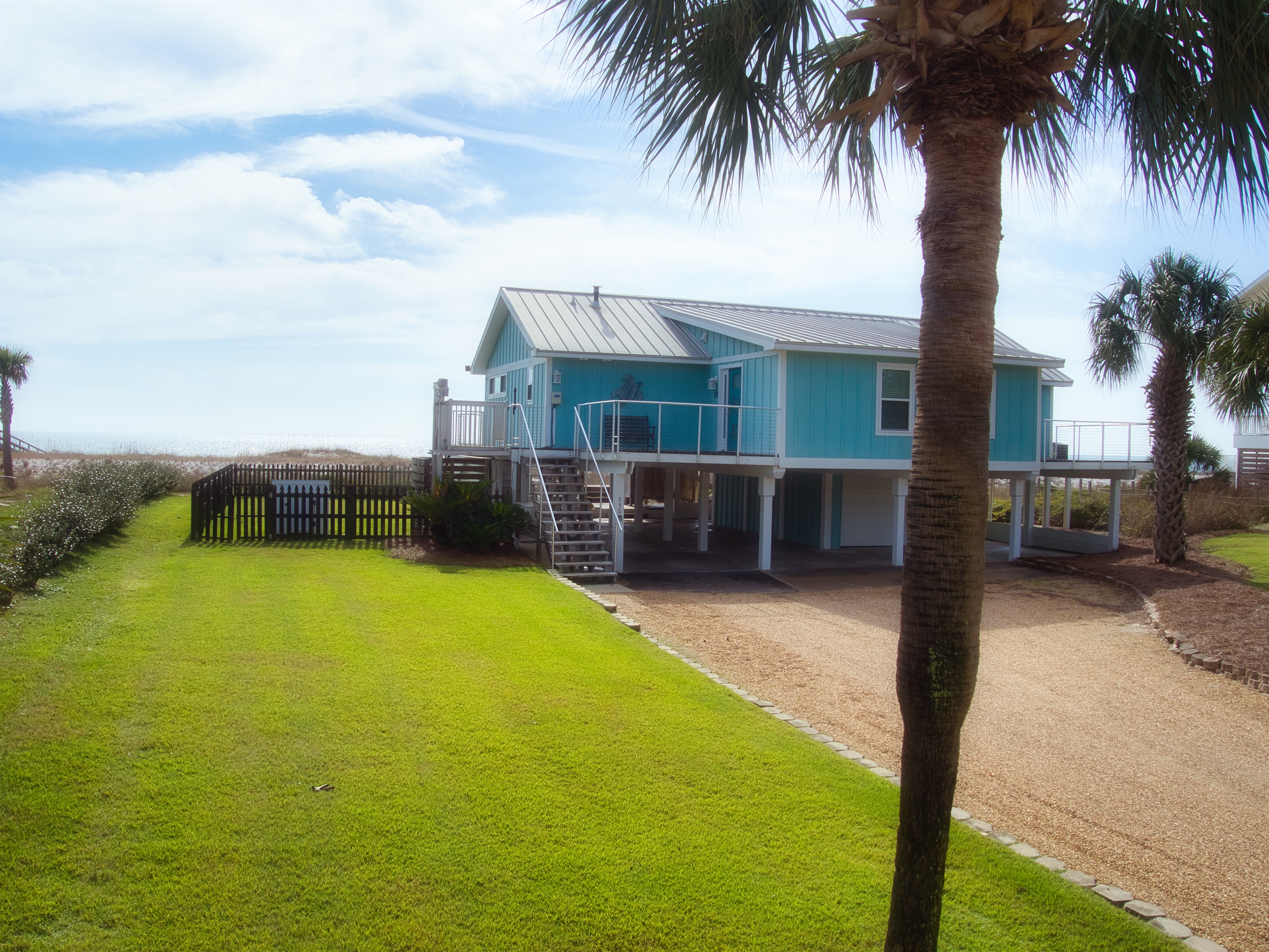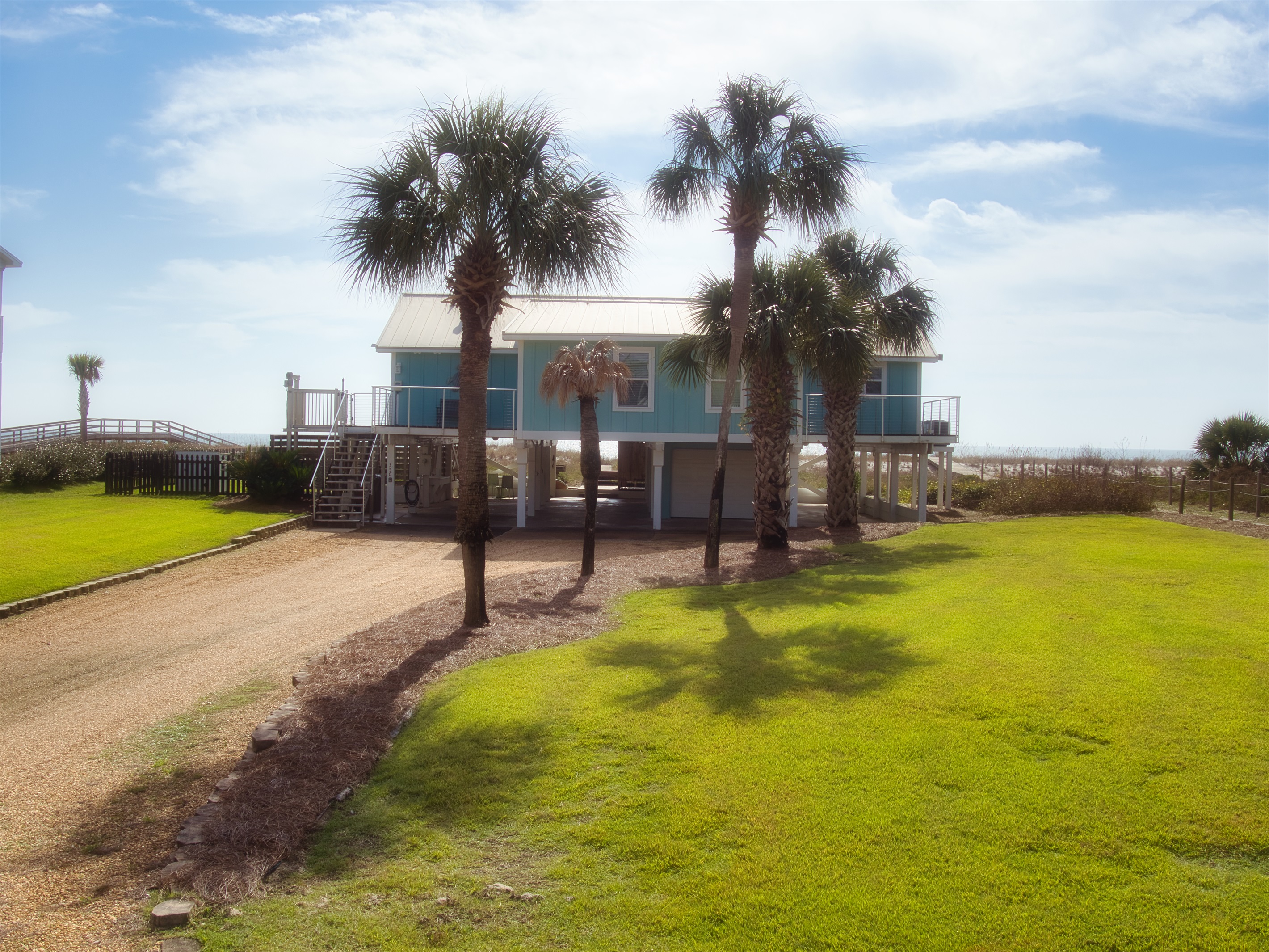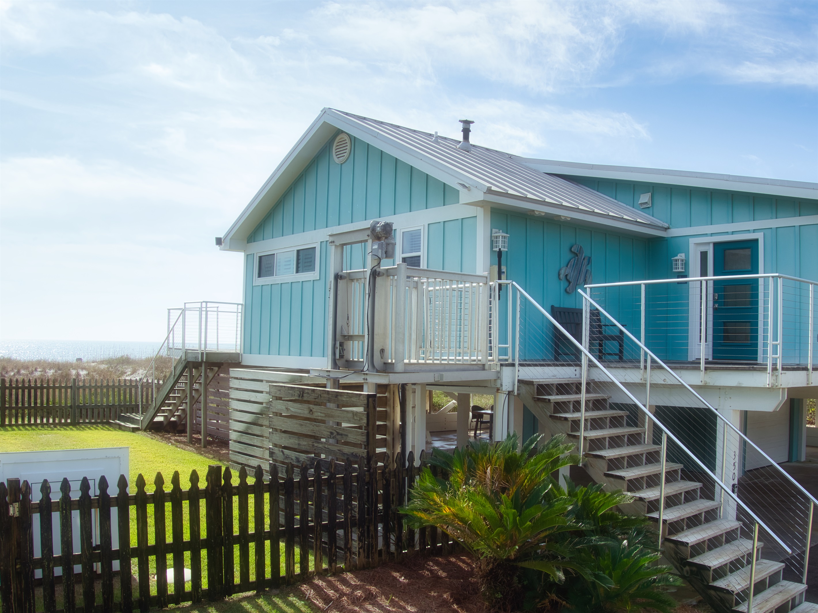 The raised, single-level home offers expansive gulf views from wrap-around decks and a convenient cargo lift to easily carry up groceries, luggage or beach gear.