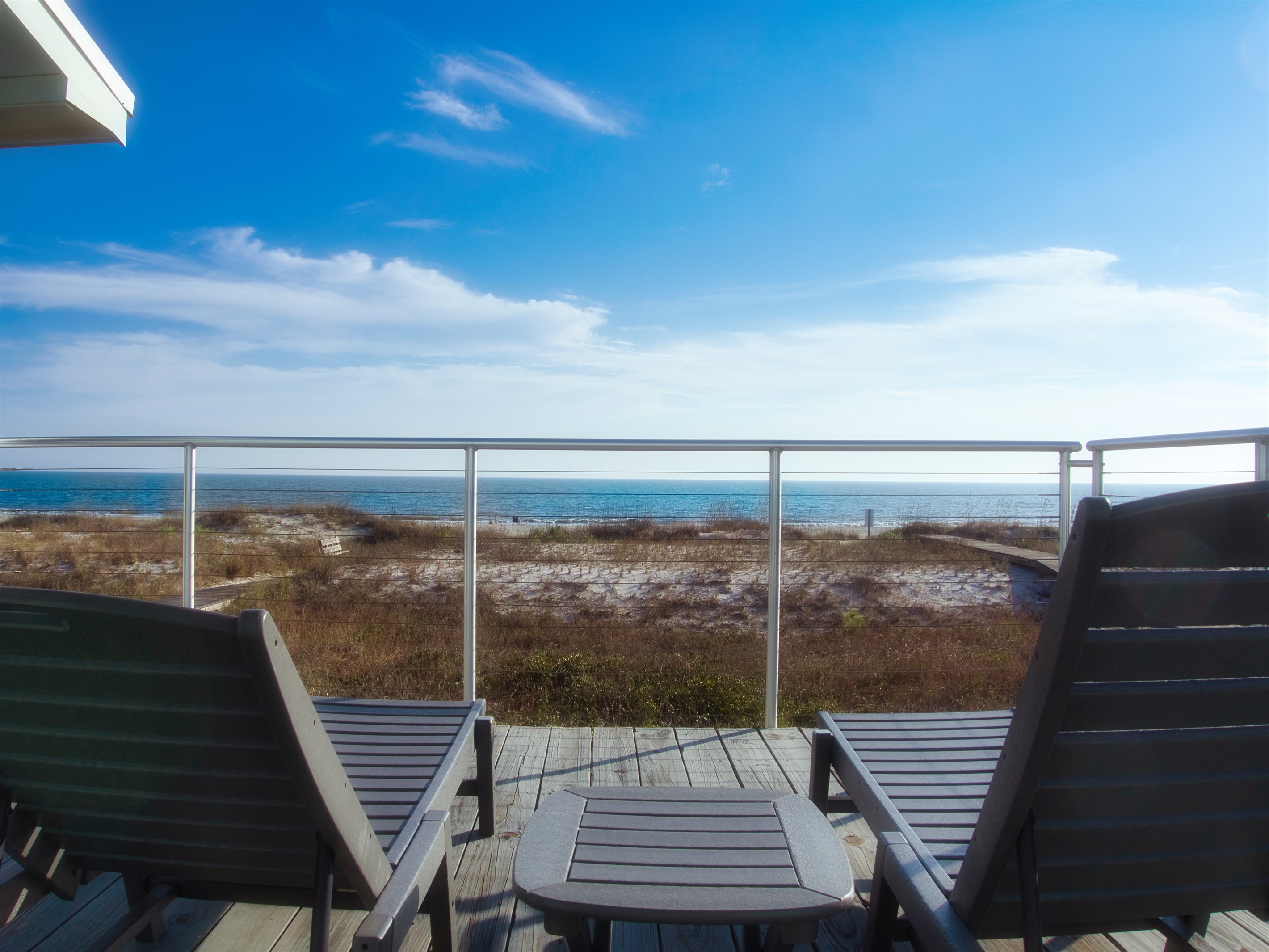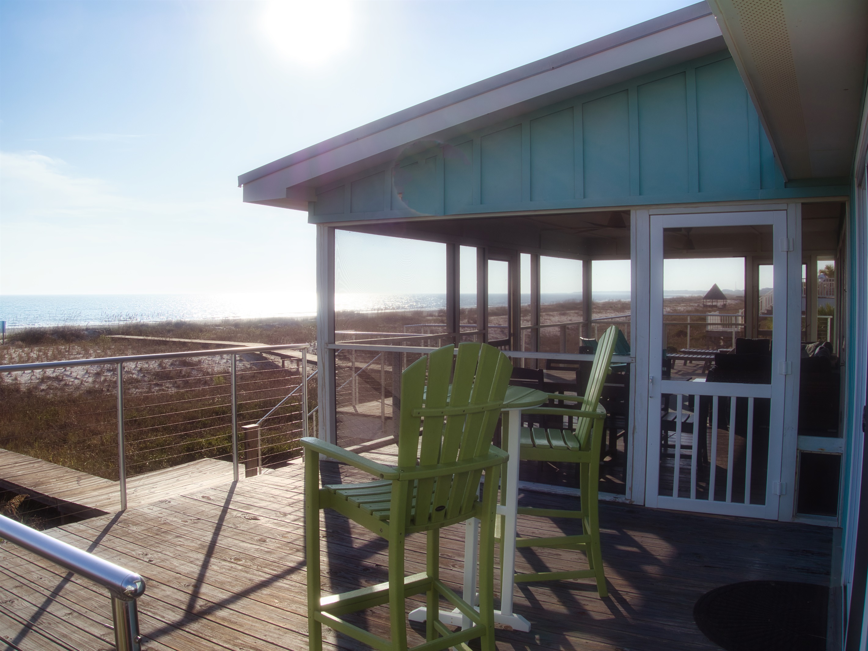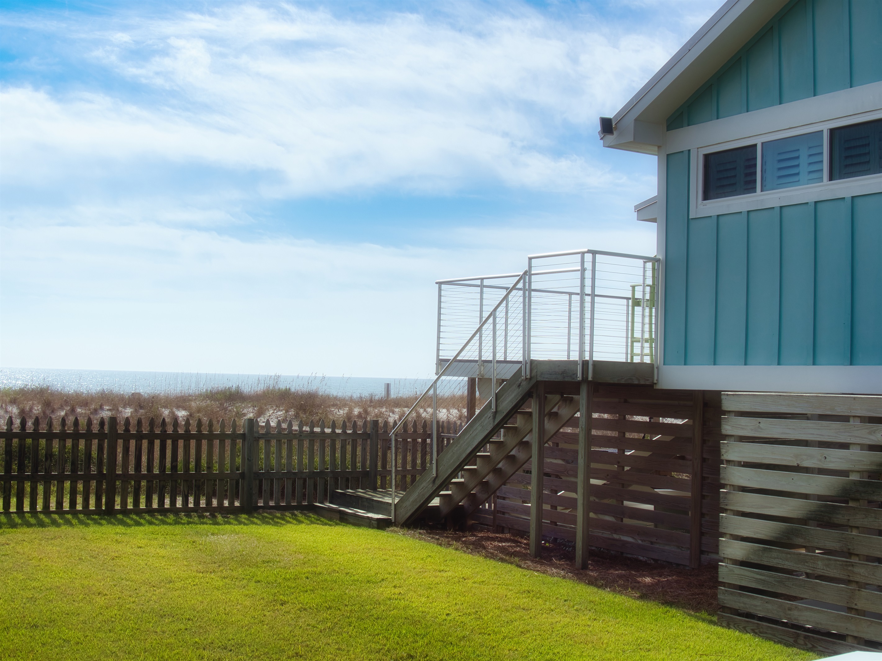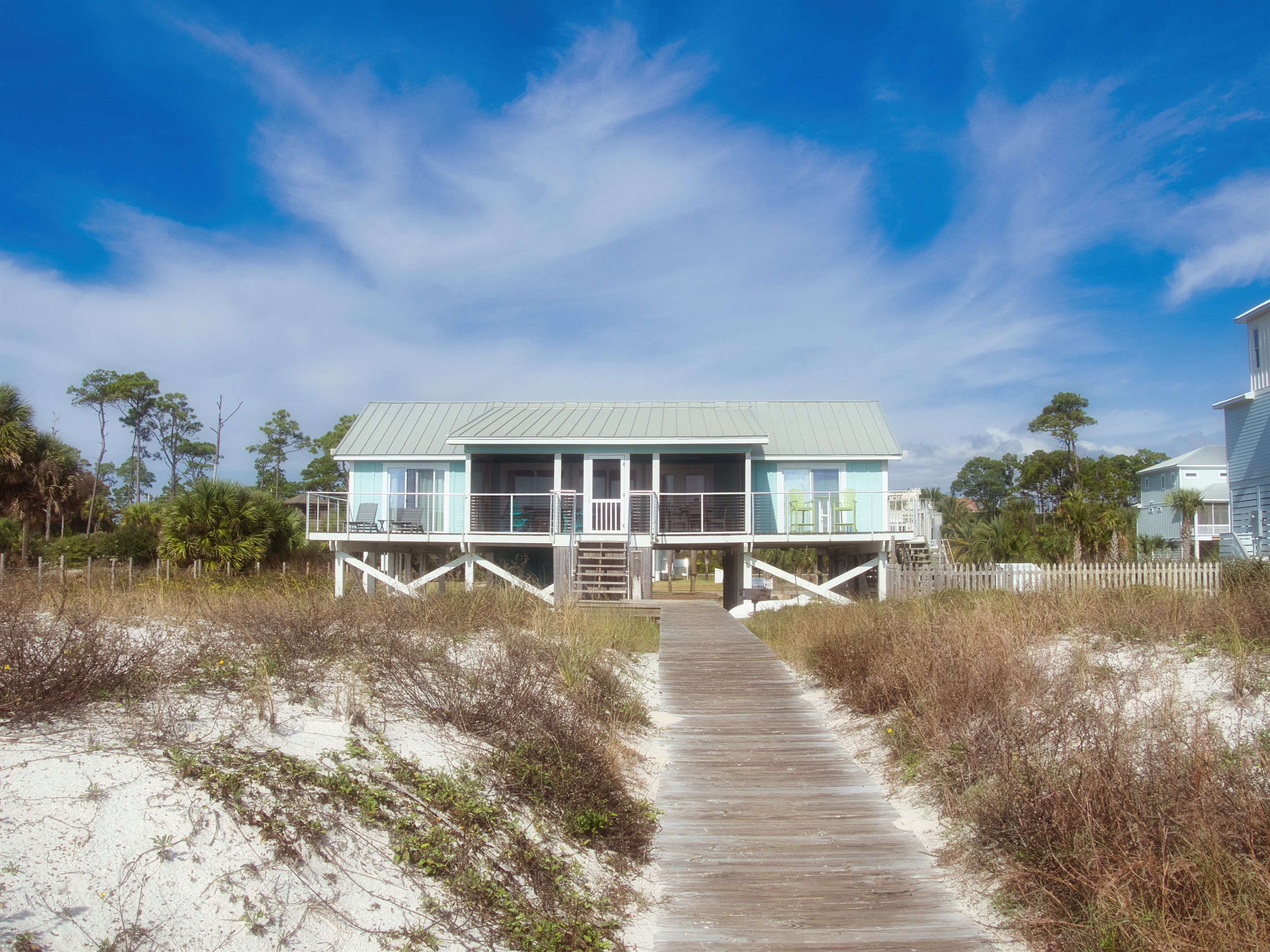 Additional, open-air decks flank the Veranda with private entrances from two of the home’s bedroom suites. Evenly laid out for maximum privacy, the home has three bedrooms to comfortably accommodate up to eight guests. Barefoot Blessings sits along a scenic stretch of the gulf with unobstructed views and easy access to the water for swimming, fishing, kayaking and paddle boarding. After a day of sandcastle-building or seashell hunting, rinse off in the outdoor shower, offering both cold and hot water. A closed-off side lawn offers a safe space for kids to play.