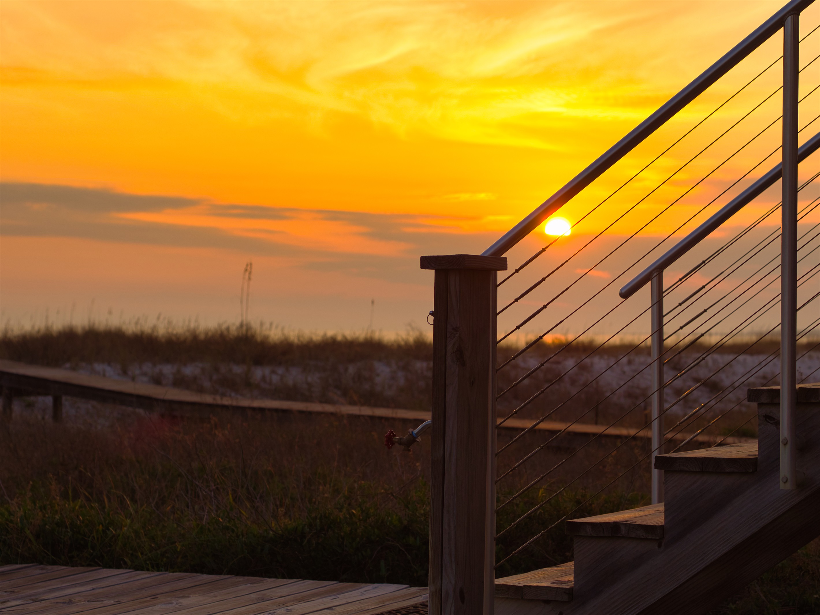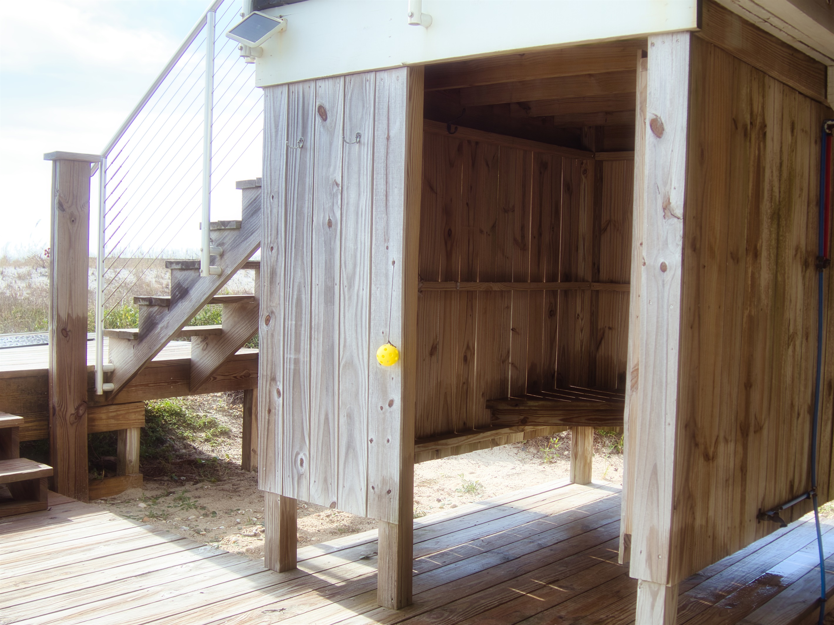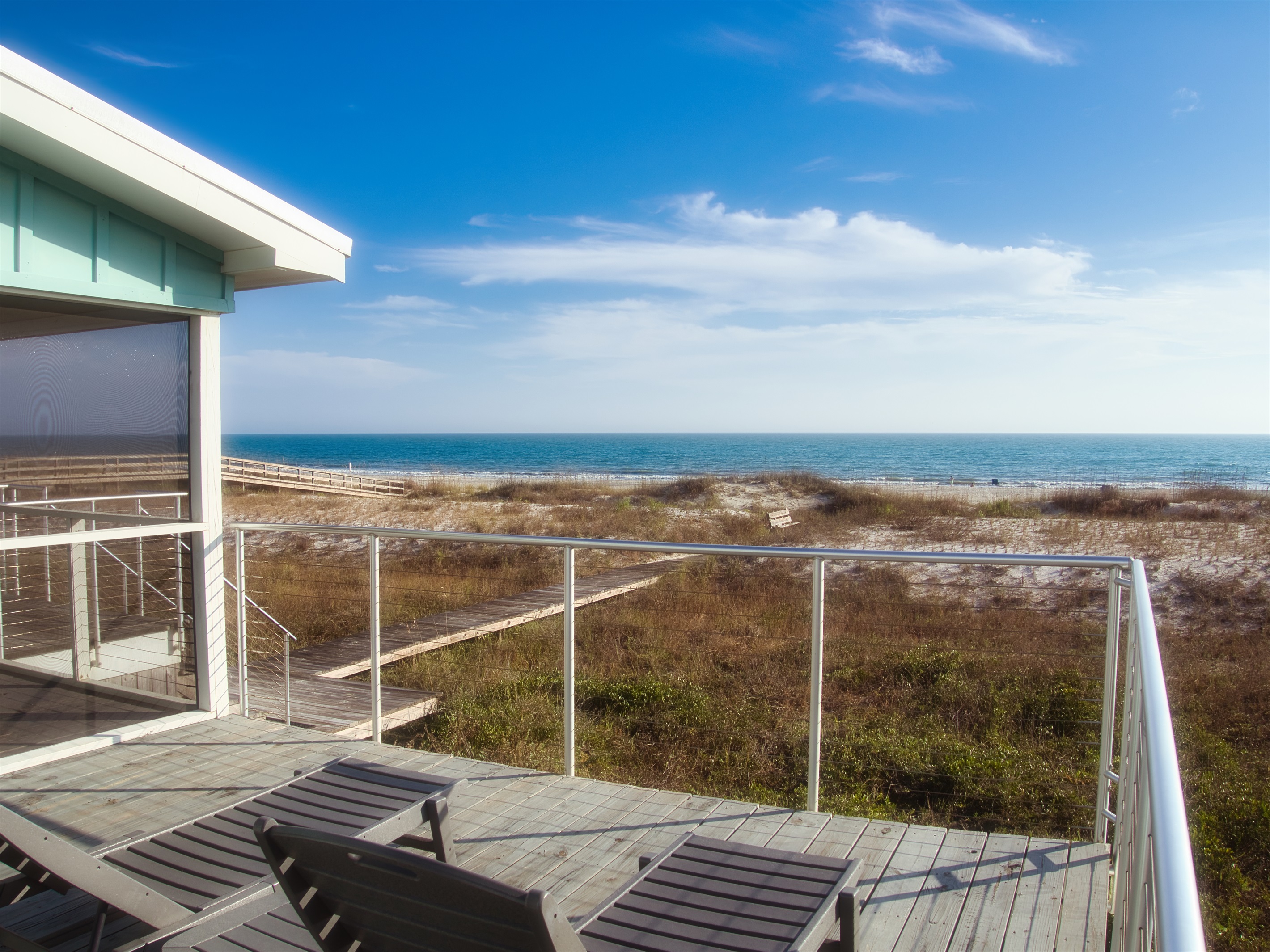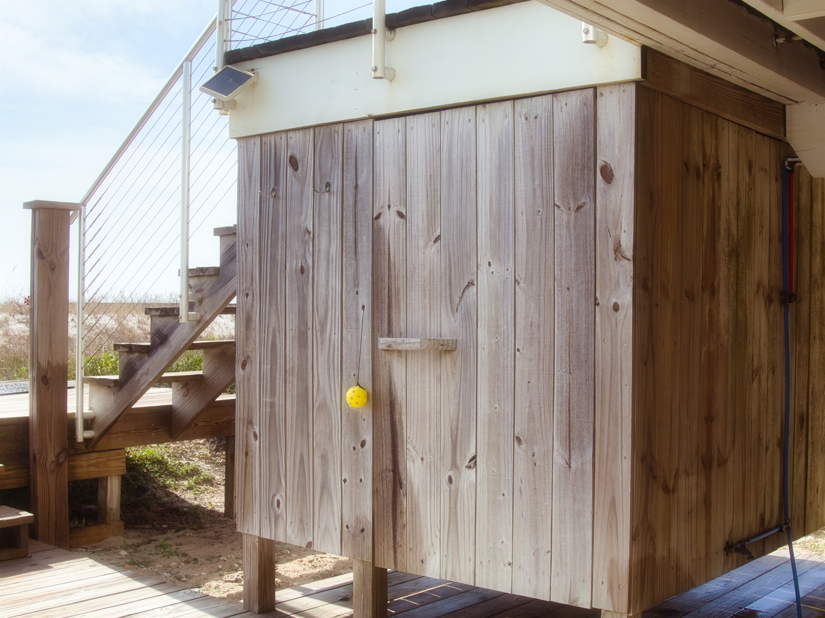 Additional, open-air decks flank the Veranda with private entrances from two of the home’s bedroom suites. Evenly laid out for maximum privacy, the home has three bedrooms to comfortably accommodate up to eight guests. Barefoot Blessings sits along a scenic stretch of the gulf with unobstructed views and easy access to the water for swimming, fishing, kayaking and paddle boarding. After a day of sandcastle-building or seashell hunting, rinse off in the outdoor shower, offering both cold and hot water. A closed-off side lawn offers a safe space for kids to play.